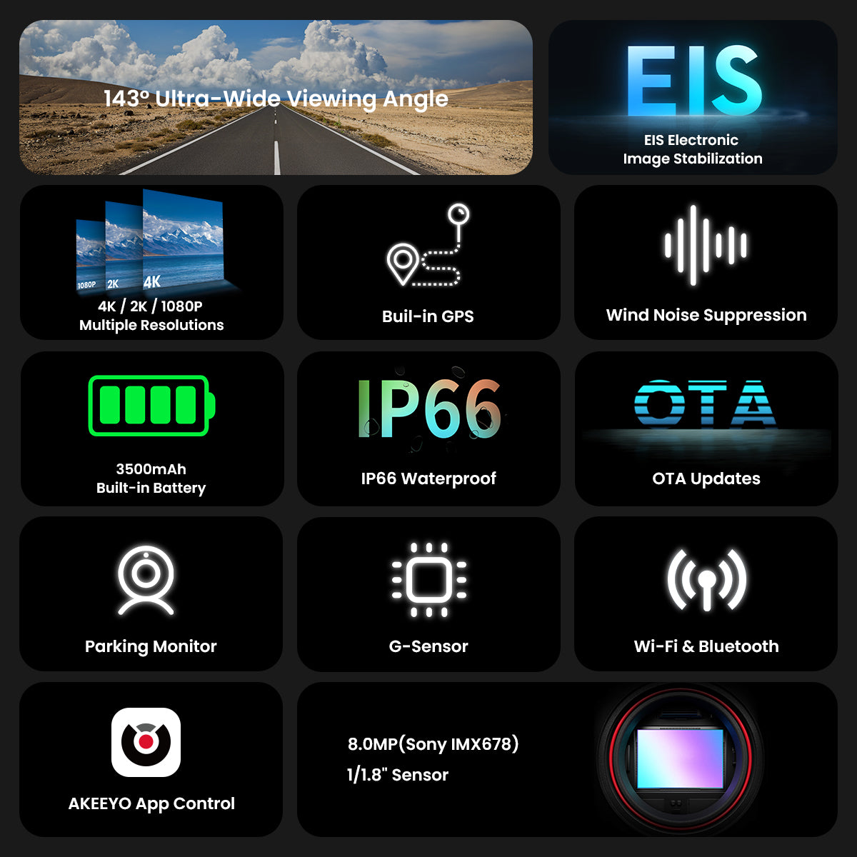- 4K high-resolution recording captures crisp detail on every ride, day or night.